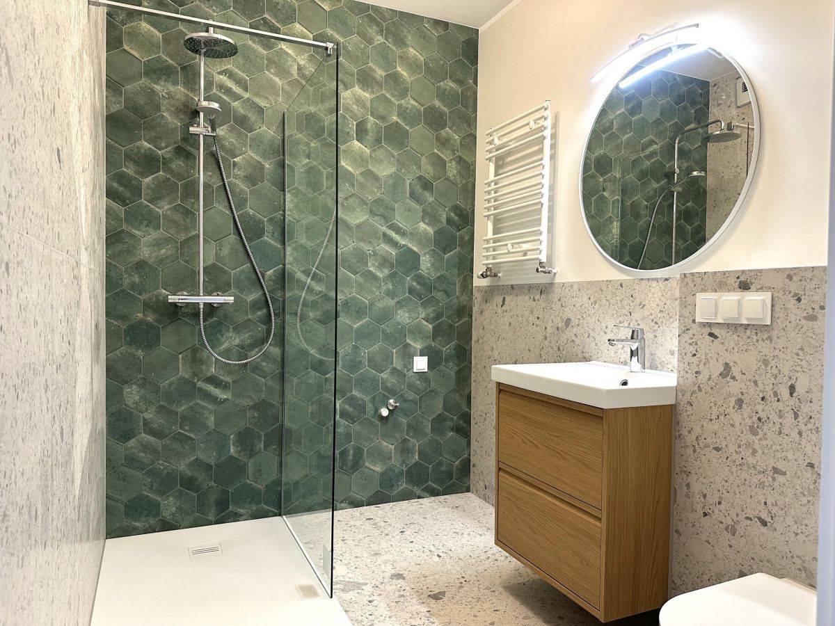 Łazienki: nowoczesne, wyposażone w komfortowe kabiny prysznicowe i wysokiej jakości armaturę.