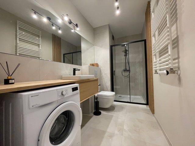 Wnętrze jest bardzo bogato umeblowane i wyposażone - znajdziesz tu rozkładany narożnik, ławę, stół z krzesłami w salonie, a kuchnia w zabudowie oferuje mnóstwo pojemnych szafek. Sprzęty AGD obejmują zmywarkę, lodówkę, piekarnik, płytę indukcyjną oraz okap podszafkowy. Sypialnia wyposażona jest w podwójne łóżko i pojemną szafę ubraniową, natomiast w korytarzu czeka kolejna duża, zabudowana szafa. W łazience znajduje się nowa kabina prysznicowa, umywalka oraz pralka.
