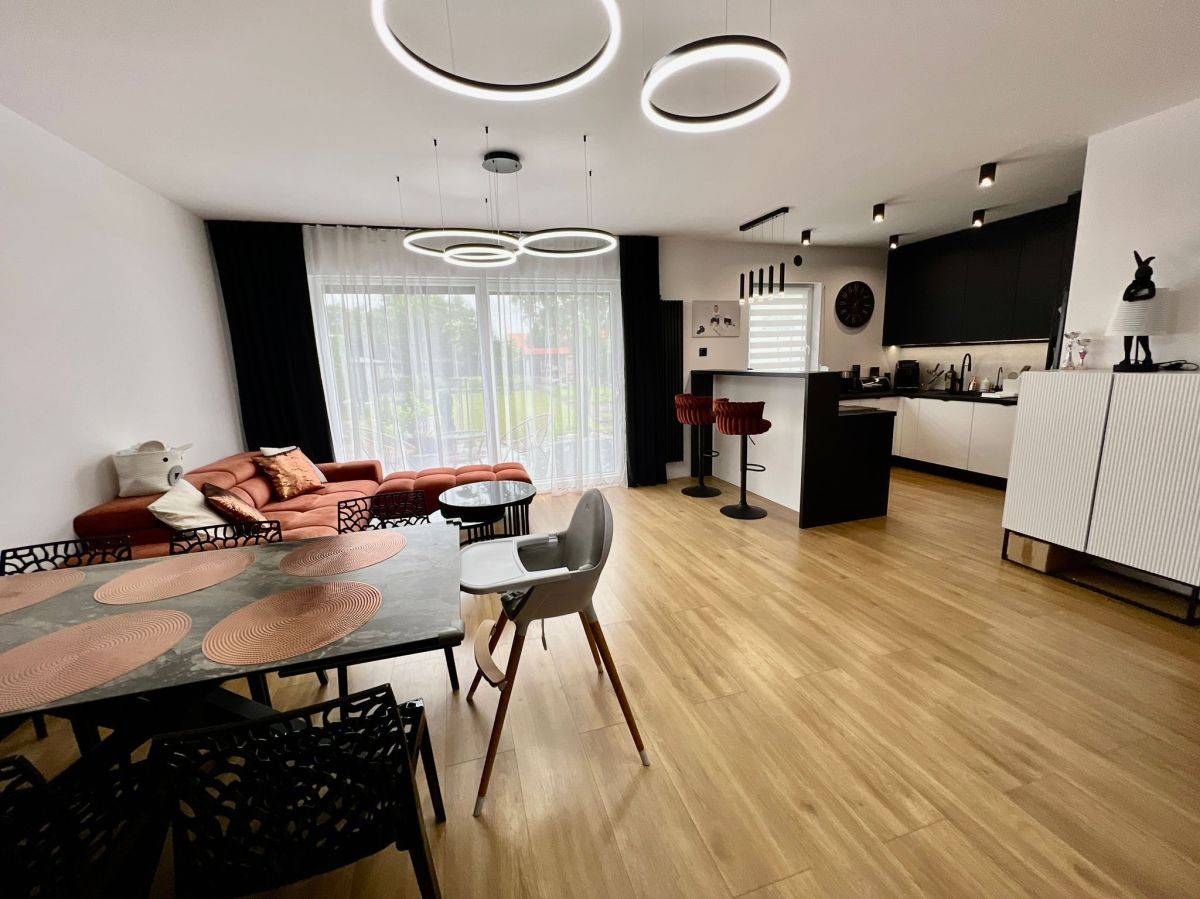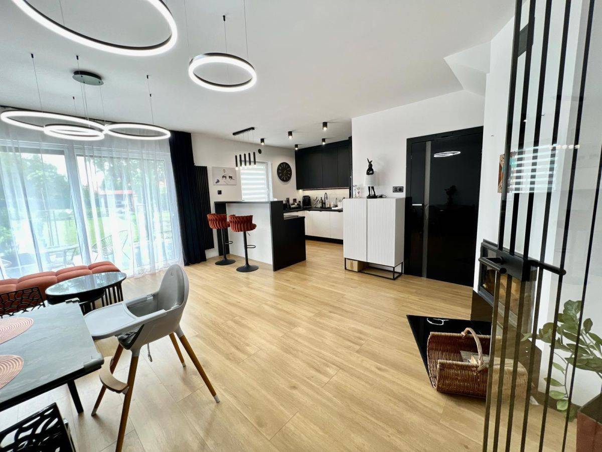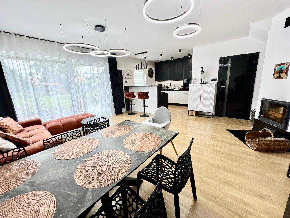 przestronny salon z kominkiem (z płaszczem wodnym) i wyjściem na duży taras oraz ogród,