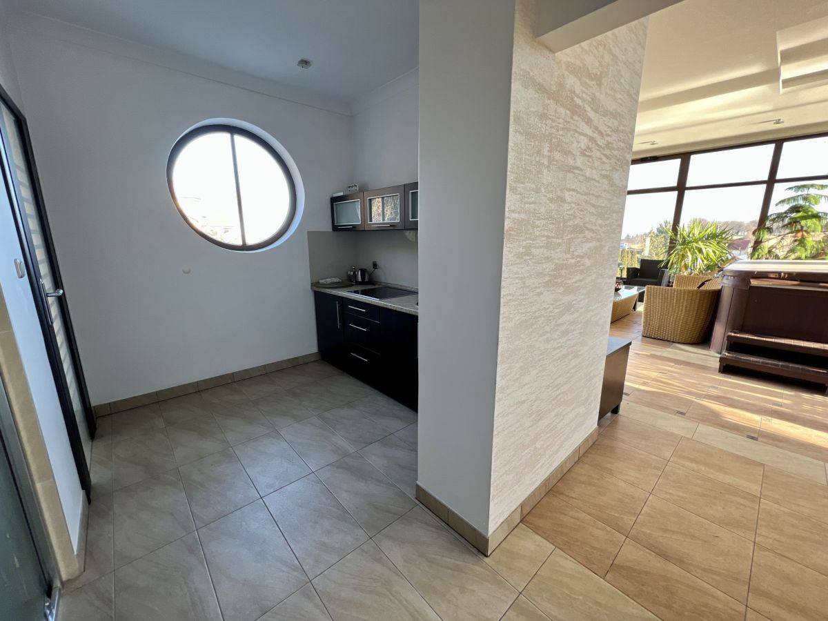 Strefa SPA: Jacuzzi, dwie sauny, natryski, szatnie, dodatkowa kuchnia, WC oraz miejsce na grilla - wszystko w osobnym budynku z panoramicznym widokiem na okolicę.