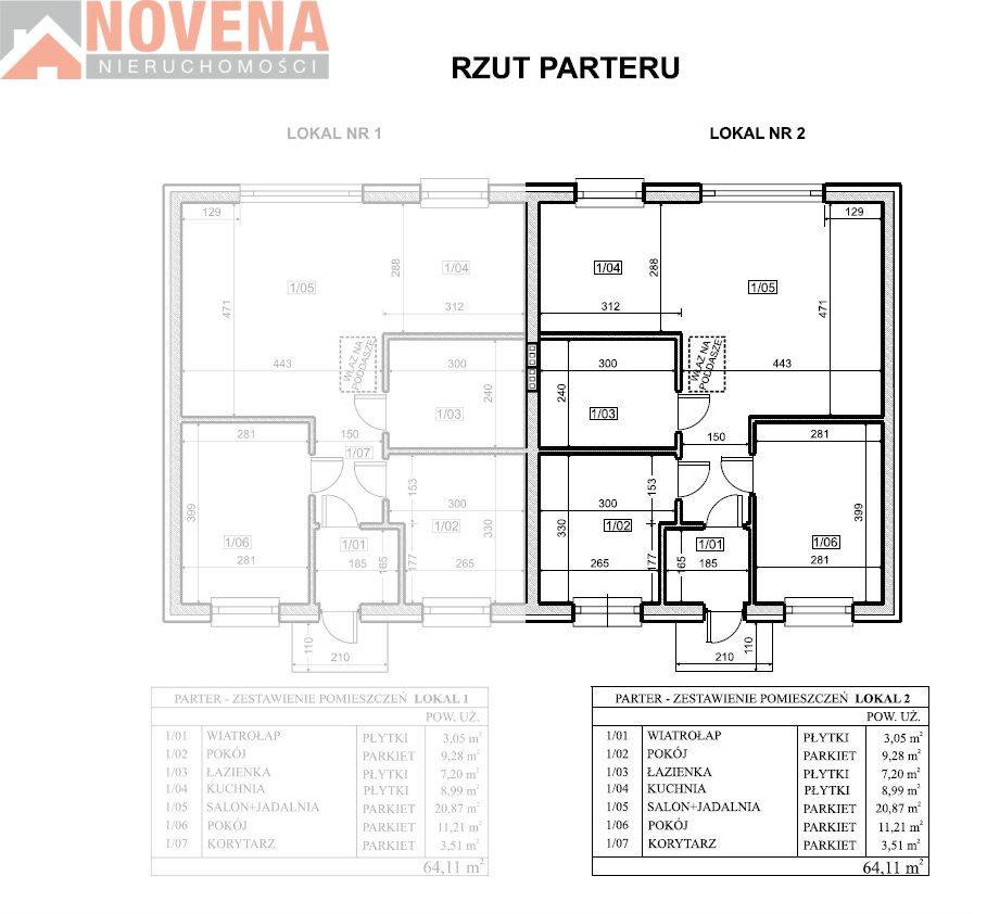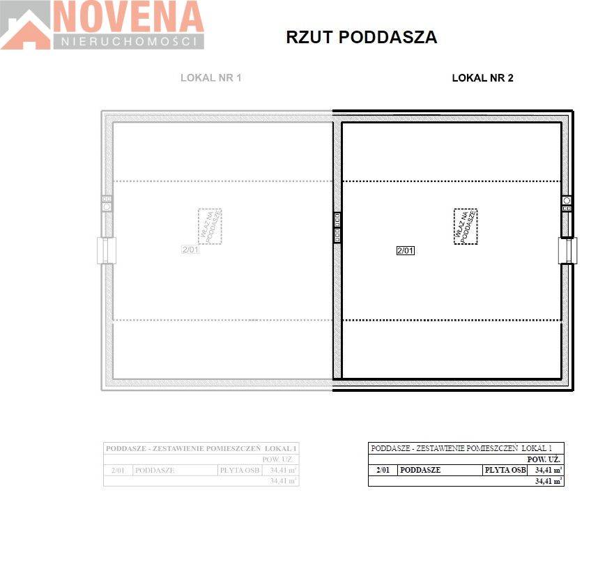 Każdy lokal mieszkalny ( prawa i lewa strona) jest o powierzchni użytkowej ok. 98,52 m2. Parter wykończony w stanie deweloperskim, poddasze do własnej aranżacji.