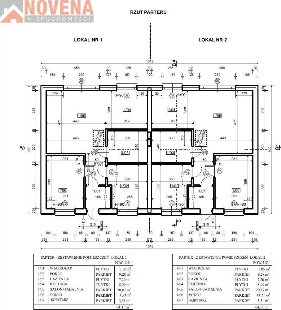 Każdy lokal mieszkalny jest o powierzchni użytkowej ok. 64,11 m2. Dodatkowo jest możliwość w przyszłości, indywidualnej adaptacji nieużytkowego poddasza: wymiary 3,3m x 7m, wys 2,2m ( trzeba zmienić sposób użytkowania).