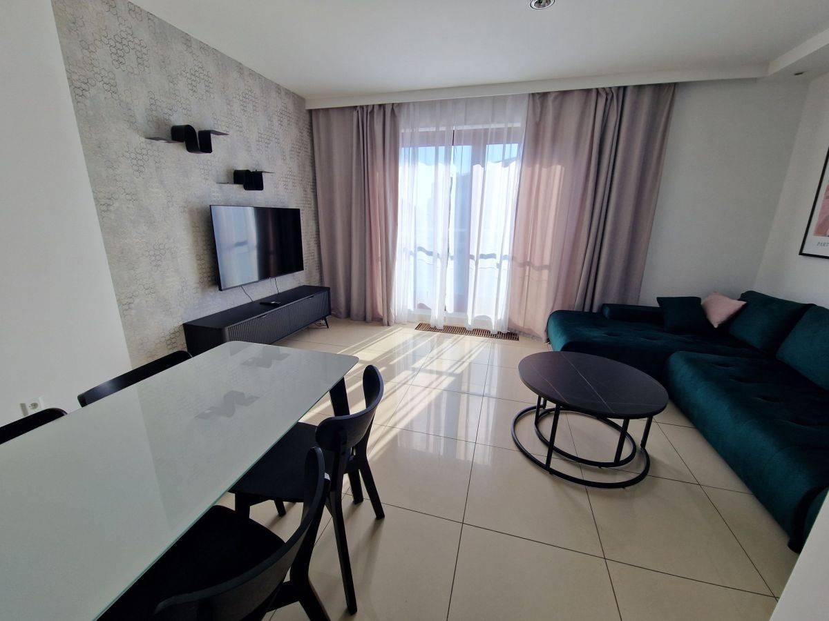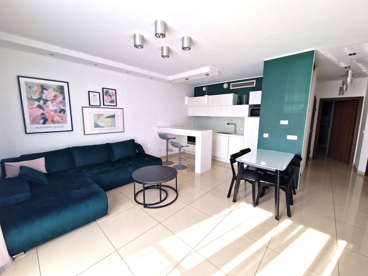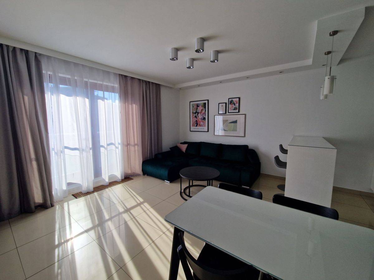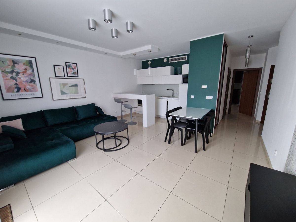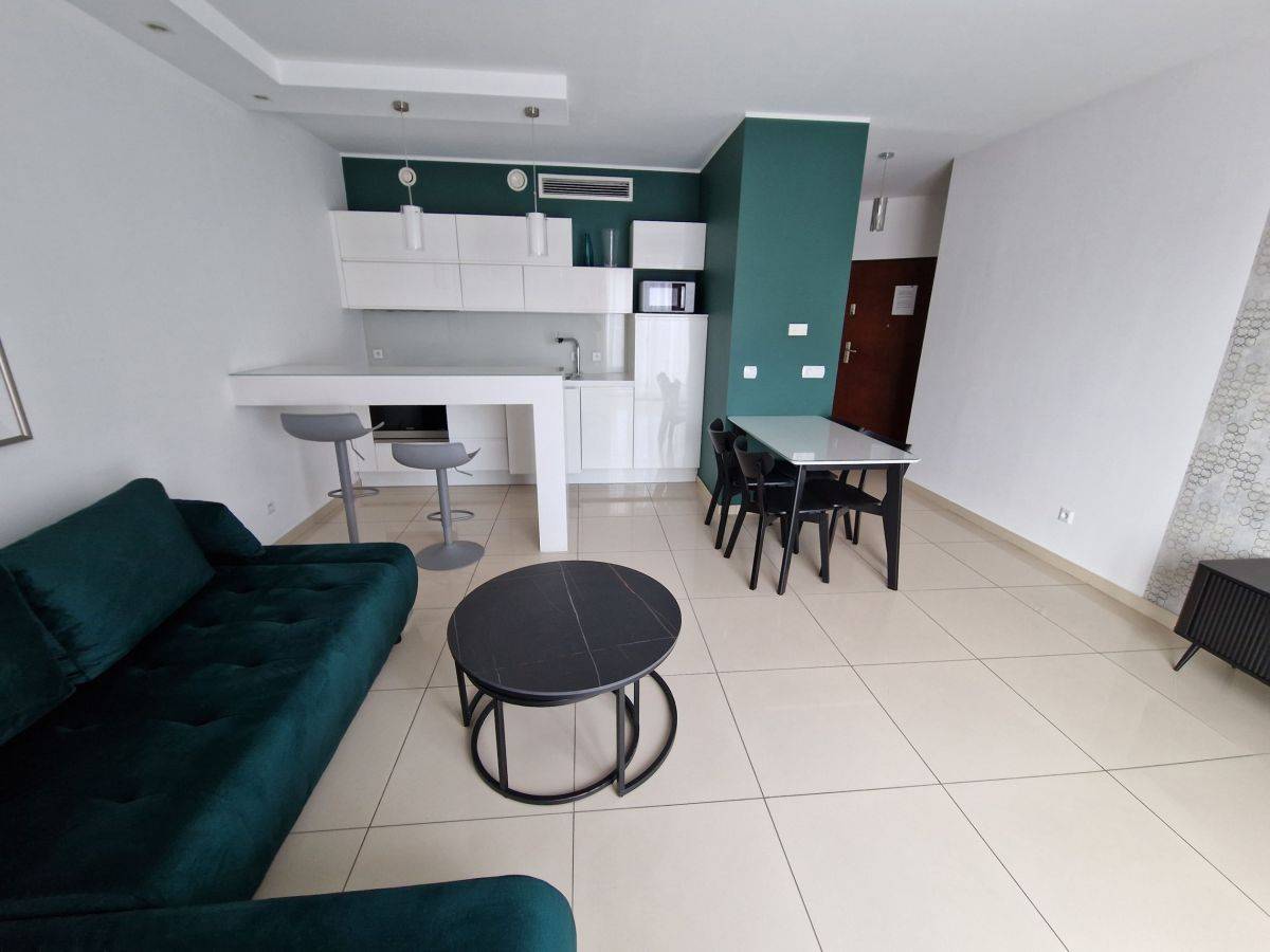 Salon połączony z aneksem kuchennym. Kuchnia wyposażona - lodówka, płyta, piekarnik, zmywarka okap. W salonie telewizor, nowa kanapa i inne wyposażenie.