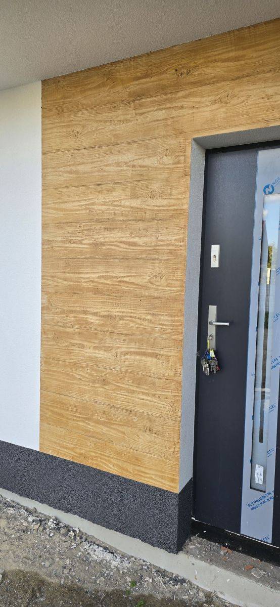 - elewacja : tynk w kolorze białym i grafitowym z elementami drewnopodobnymi (odcisk w tynku)