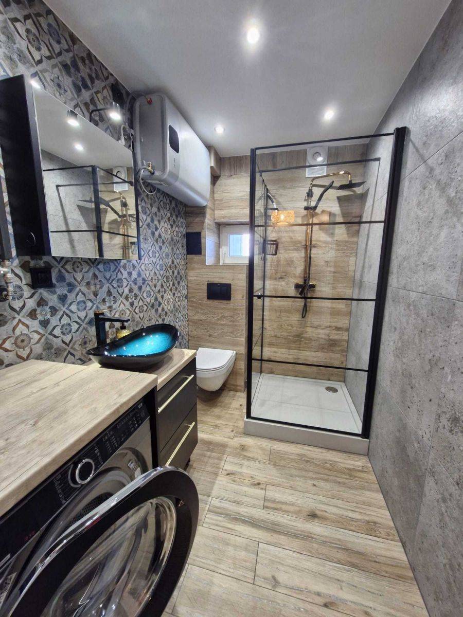 - nowoczesna łazienka z kabiną prysznicową i pralką