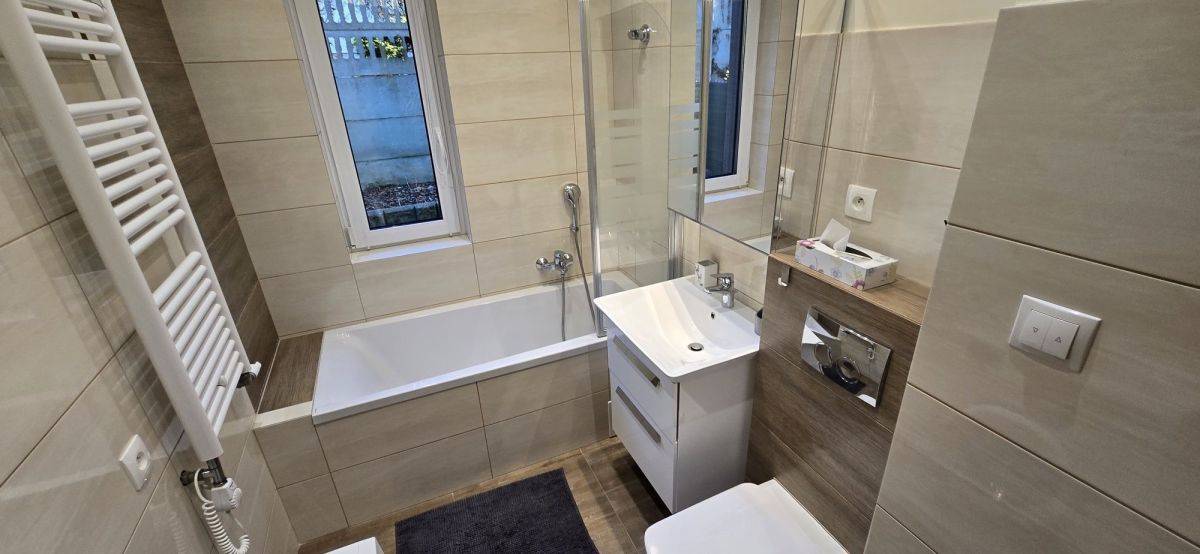 - elegancka łazienka, wyposażona w wannę ze szklaną szybą prysznicową