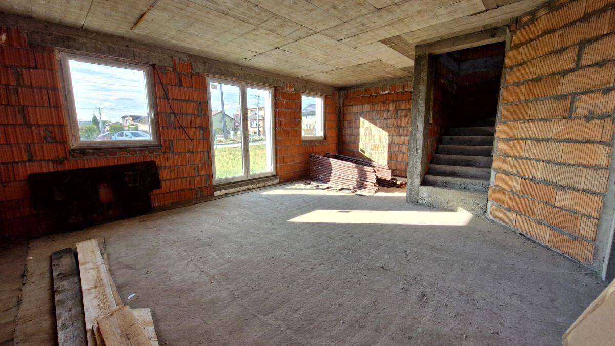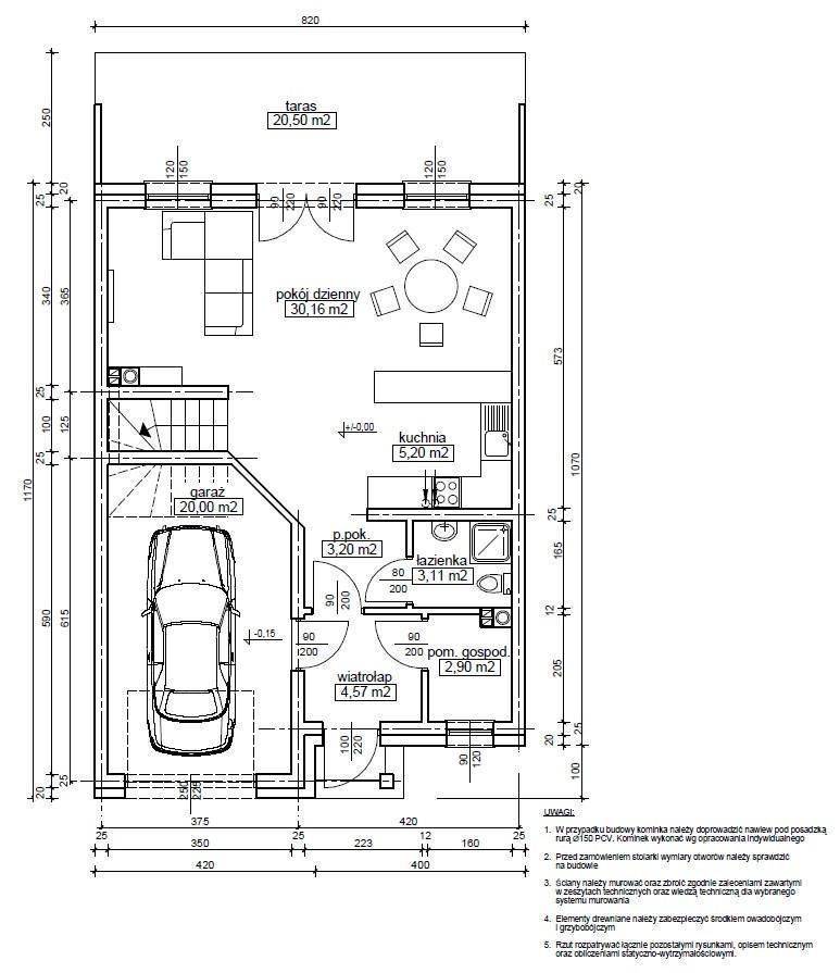 Na parterze znajdują się : duży salon z otwartą kuchnią i wyjściem na taras, wiatrołap kotłownia, garaż.