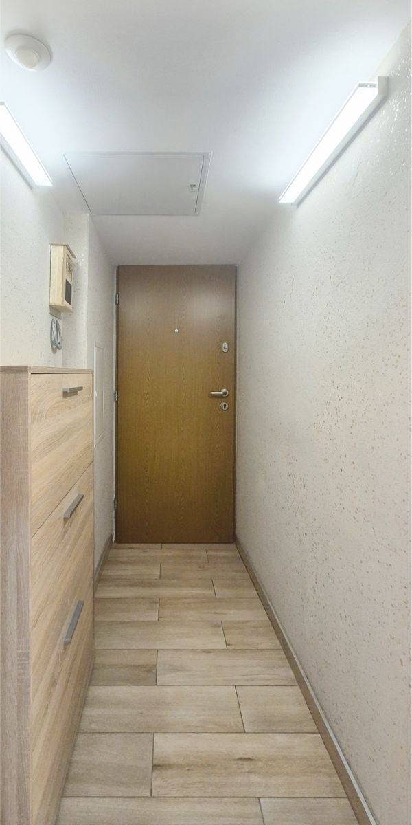 Przedpokój jest funkcjonalnie podzielony i wyposażony w dodatkowe drzwi, co pozwala wygodnie oddzielić strefy mieszkania.