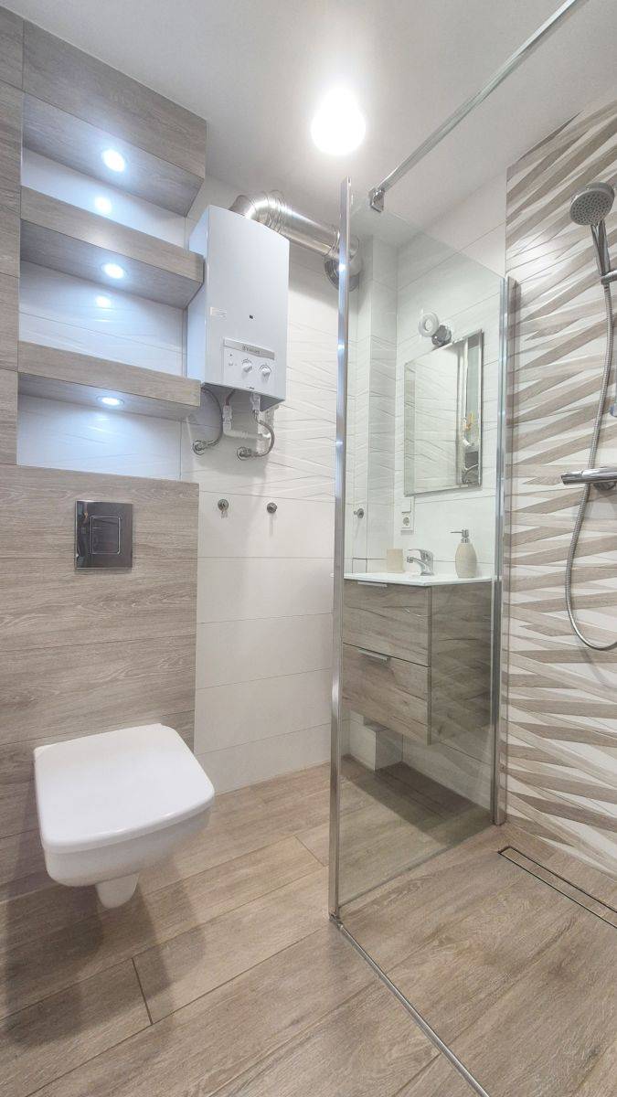 Ogrzewanie pochodzi z sieci miejskiej, natomiast ciepłą wodę zapewnia nowoczesny, kilkumiesięczny piecyk gazowy renomowanej marki Vaillant.