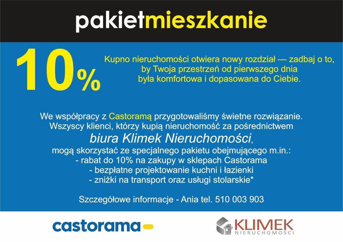 Dlatego klienci Klimek Nieruchomości, którzy kupią z nami nieruchomość, mogą skorzystać ze specjalnego pakietu dzięki naszej współpracy z Castoramą, obejmującego m.in.: