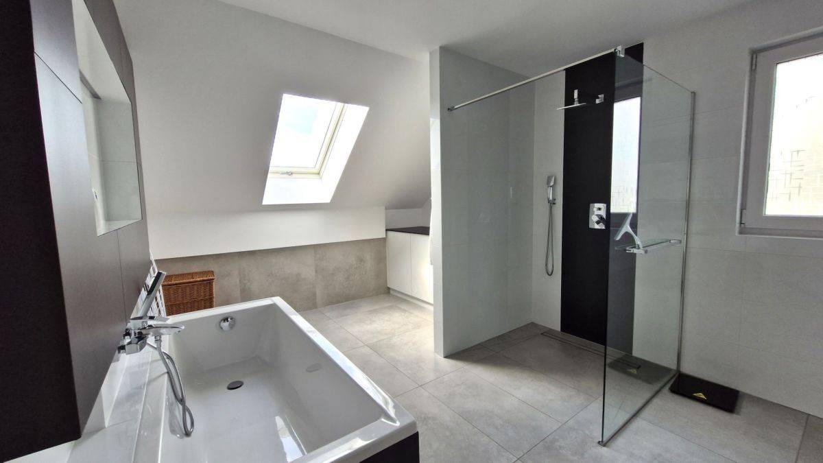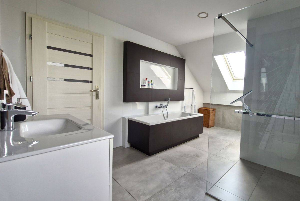 Duży pokój kąpielowy z wanną i prysznicem