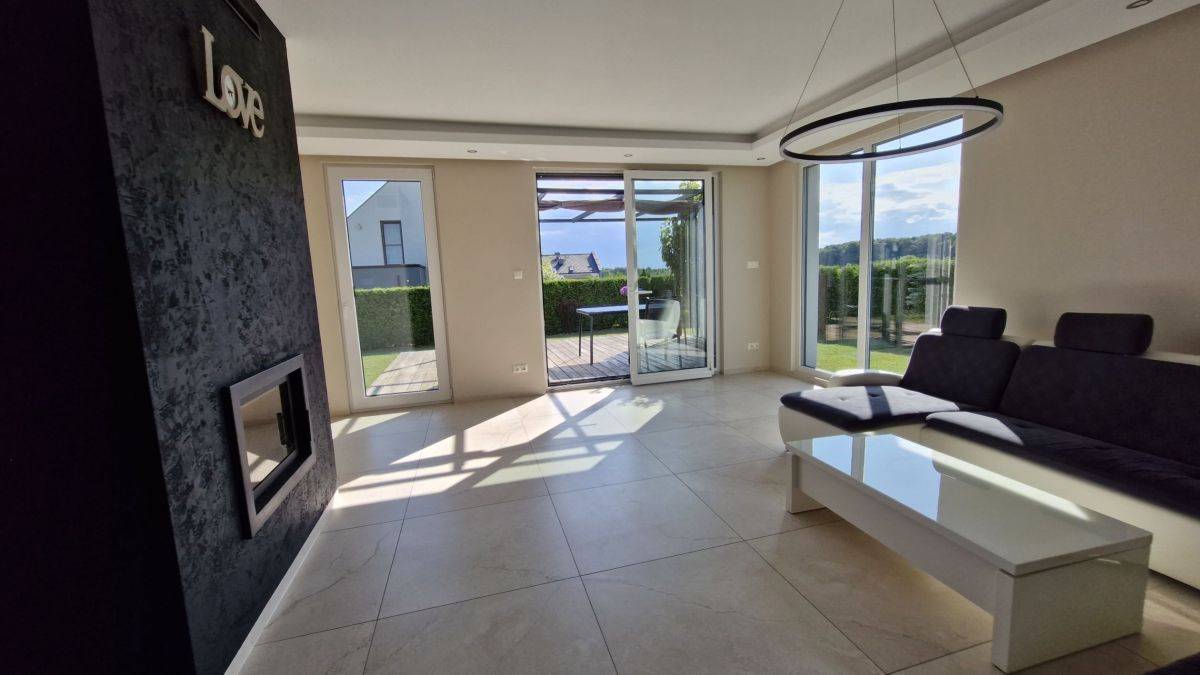 Przestronny salon z dużymi przeszkleniami i wyjściem na taras
