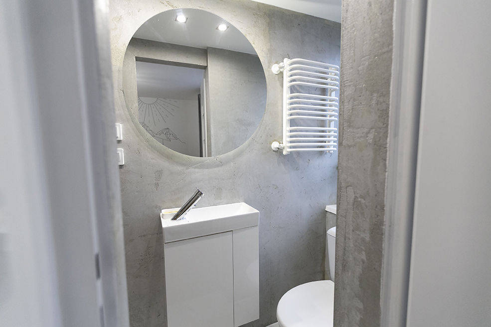 Łazienka urządzona w nowoczesnym, minimalistycznym stylu, bardzo jasna.