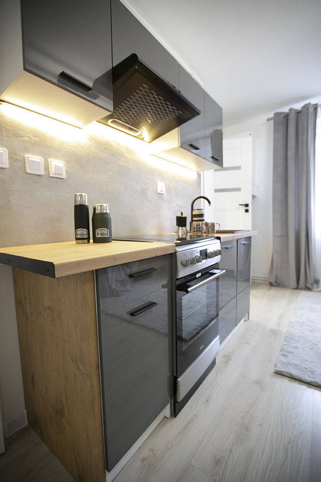 Meble kuchenne z kuchenką gazową i piekarnikiem.