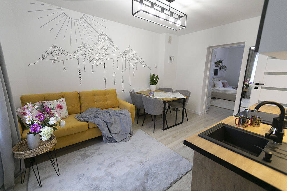 W salonie rozkładana kanapa z funkcją spania, w sypialni łóżko dwuosobowe z pojemnikiem na pościel. Dodatkowo na wyposażeniu pojemna szafa, fotel, stół jadalniany i krzesła.