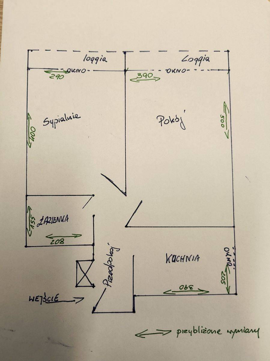 przedpokój, łazienka , sypialnia z loggią, salon z loggią , kuchnia.