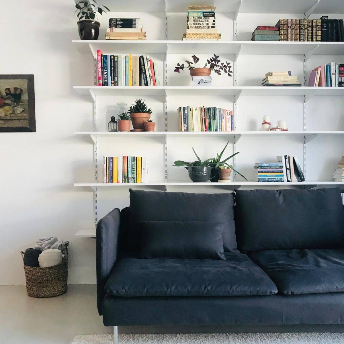 sofa, stolik, liczne półki