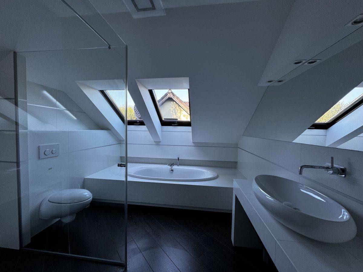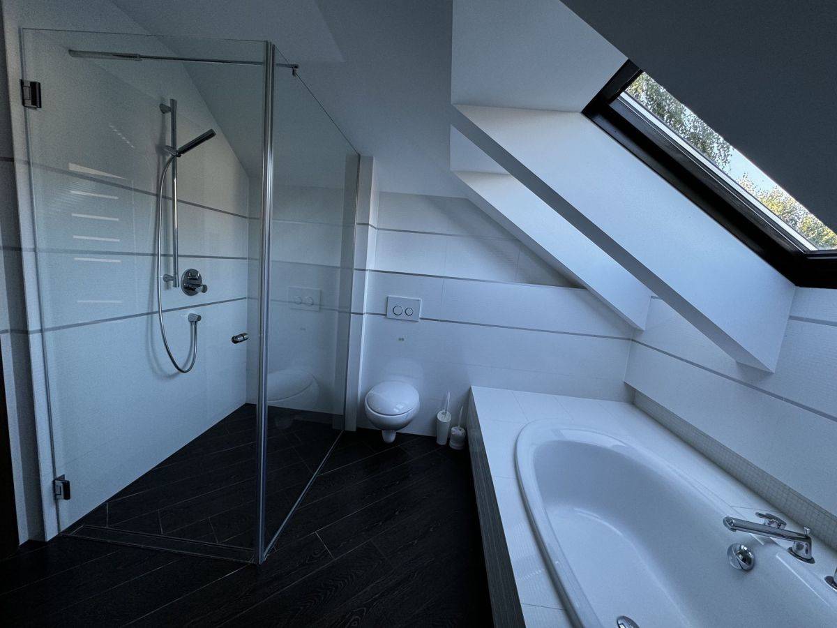 Łazienka (6 m2) z wanną i prysznicem, okno dachowe doświetlające pomieszczenie