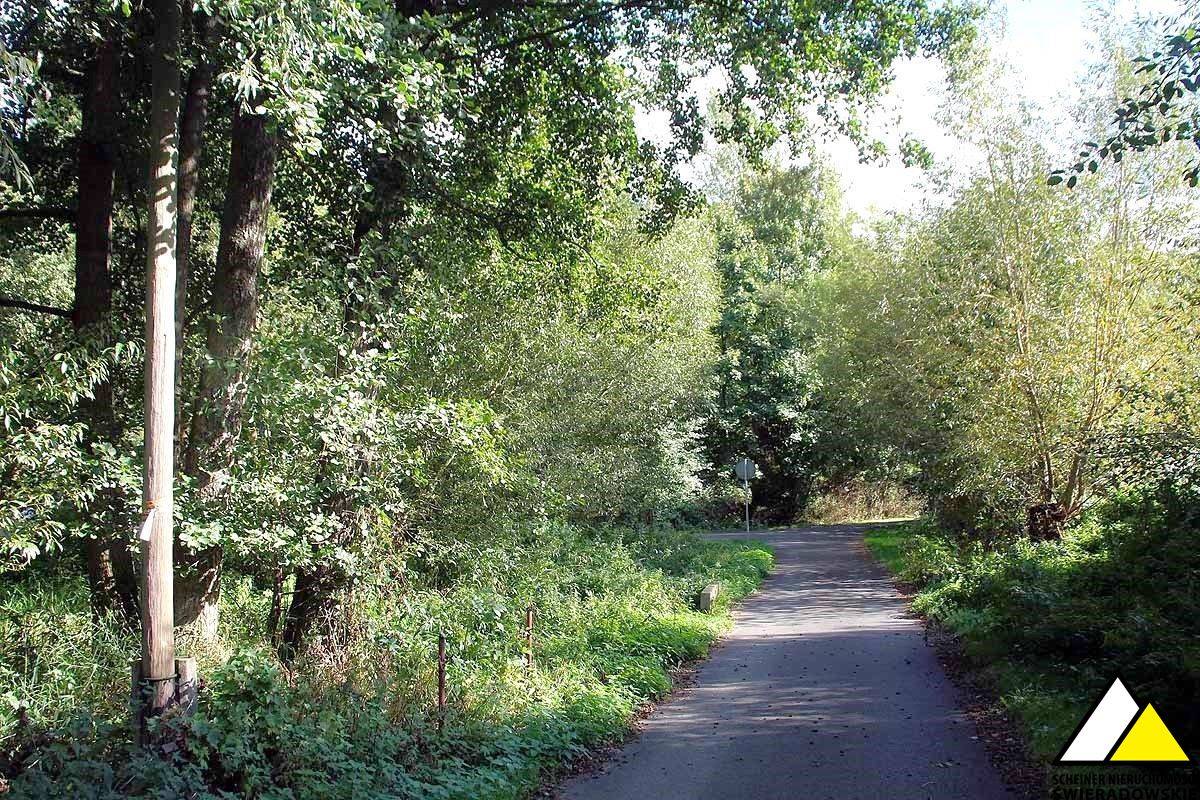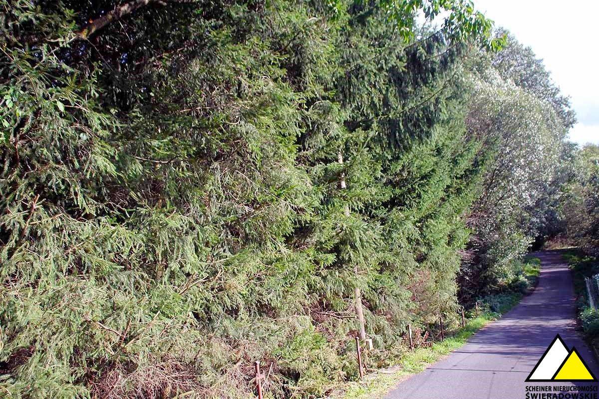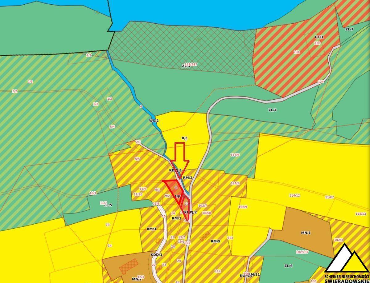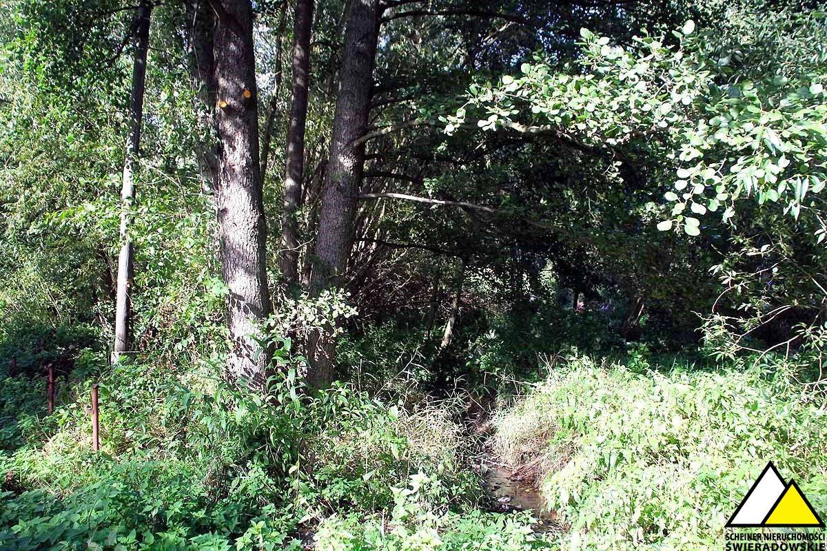 Teren porośnięty drzewami. Przez jedną z działek płynie strumyk.