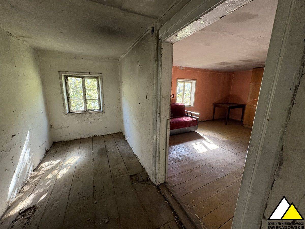 Parter: korytarz, 4 pomieszczenia w tym jedno ze starym piecem, wejście do piwnicy i do części gospodarczej.