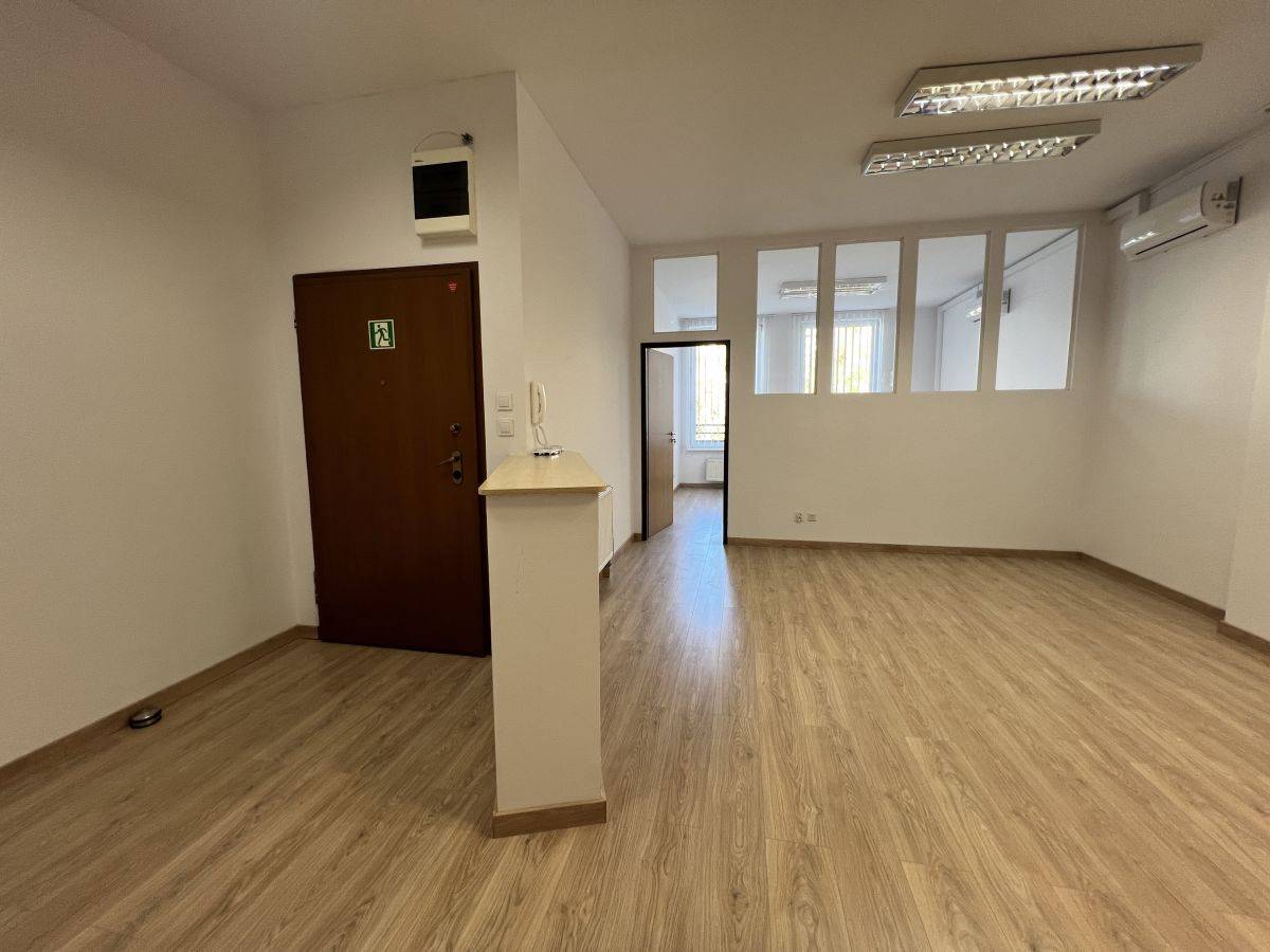 Lokal świeżo po remoncie - posiada nową klimatyzację oraz nowe podłogi, położony jest na drugim piętrze w kompleksie usługowo-mieszkalnym, ma powierzchnie 56,7 m2 i składa się z 2 pomieszczeń biurowych z sekretariatem (45,3 m2), małego zaplecza (4,8 m2), zaplecza socjalnego (4,4 m2) oraz zaplecza sanitarnego (2,2 m2). Okna z jednej strony, z widokiem na parking oraz teren zielony!