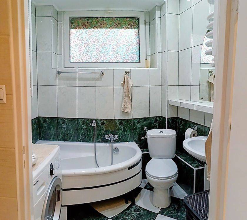 Łazienka z niedużą wanną i oknem.