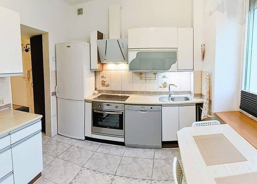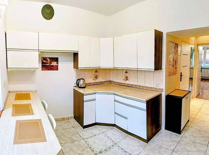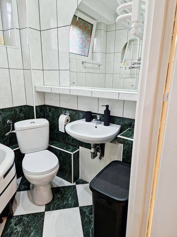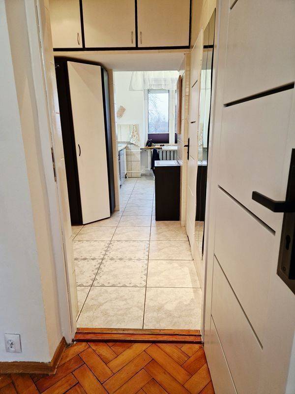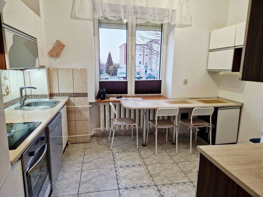 Mieszkanie składa się z dwóch pokojów (przechodnie), łazienki z oknem, dużej, umeblowanej kuchni i przedpokoju.