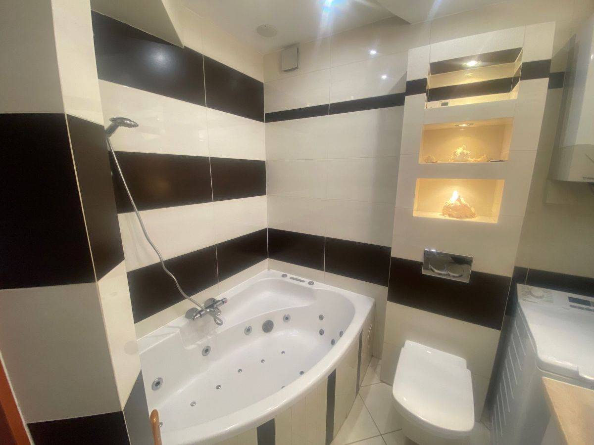 Łazienka to prawdziwa oaza relaksu — wanna z hydromasażem dla dwóch osób, programy kąpielowe i automatyczne osuszanie, a także pralka Time Manager Electrolux. Dodatkowo, zainstalowane jest nowoczesne oświetlenie LED i halogenowe, a w suficie umieszczone wodoodporne głośniki, które zwiększą komfort podczas codziennego użytkowania.
