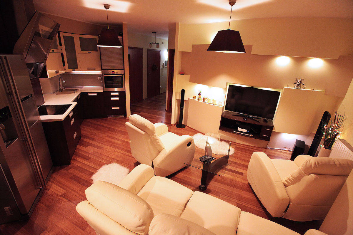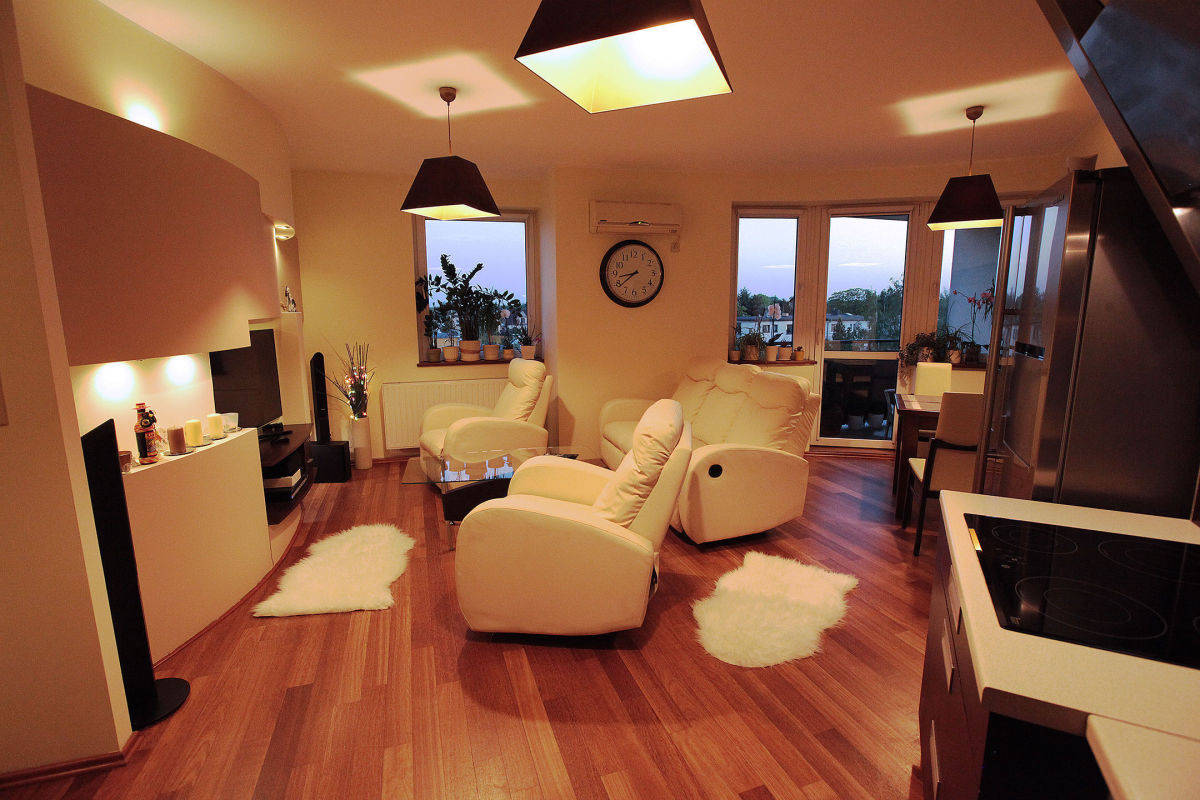 - Otwartą przestrzeń o powierzchni 30 m², łączącą kuchnię, przedpokój i salon