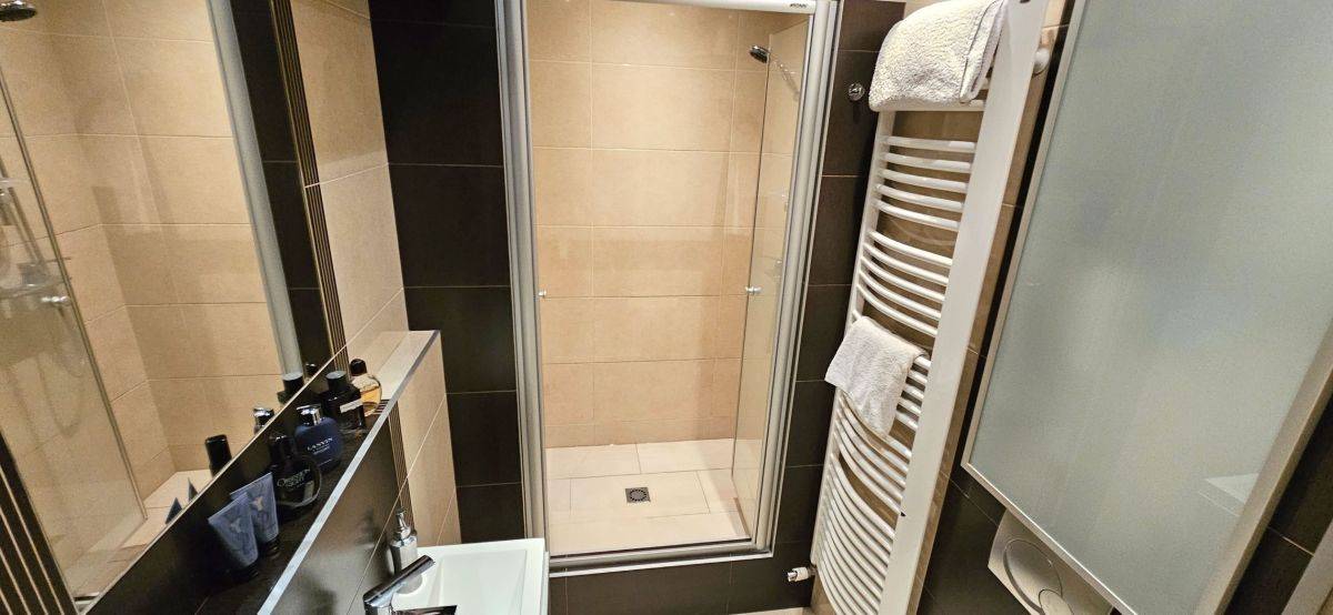 - łazienka z WC i zabudowanym prysznicem