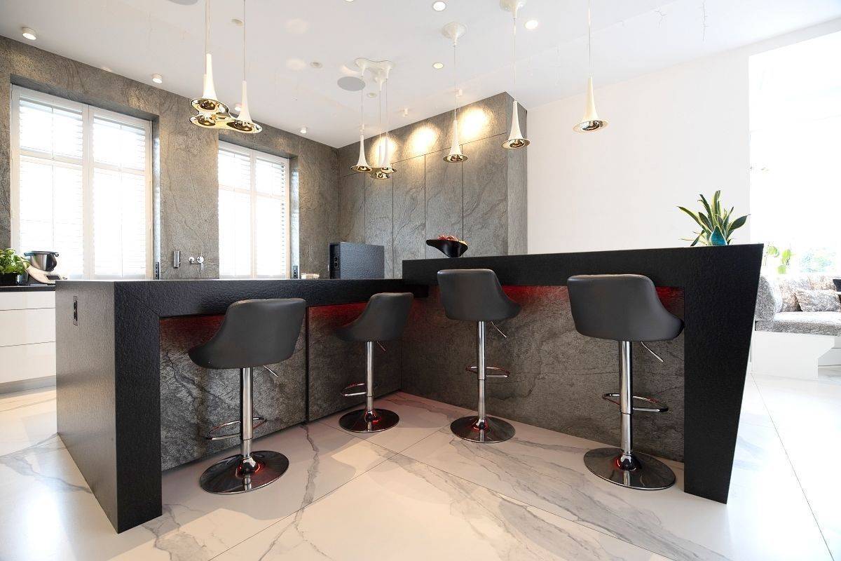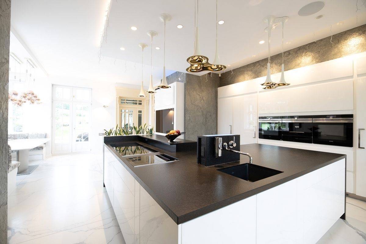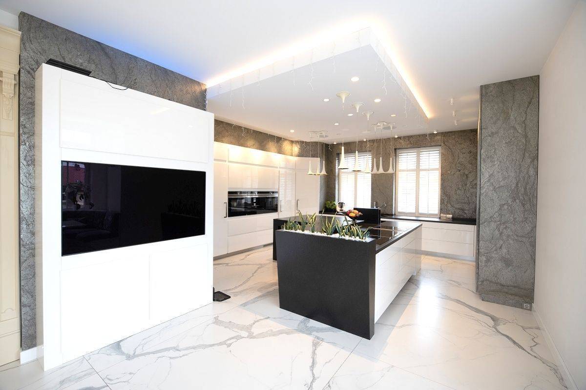 Kuchnia w zabudowie wykonana z wysokiej jakości materiałów oraz wyposażona w sprzęty AGD. Na wyposażeniu znajdują się 2 zmywarki, 2 piekarniki, 2 lodówki, zamrażarka, 2 płyty indukcyjne, płytę do grilowania oraz zabudowany ekspres do kawy. W środkowej części kuchni znajduje się również duża wyspa ze zlewem oraz 4 miejscami siedzącymi. W części jadalnianej duży stół oraz wygodne kanapy.