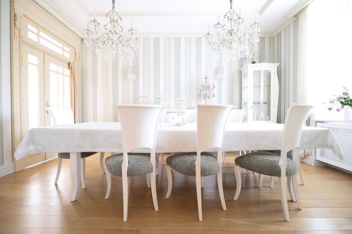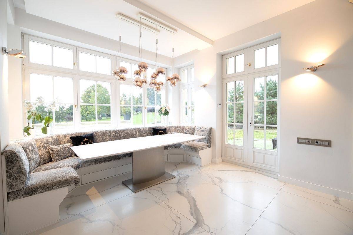 W jadalni duży stół, który pomieści 10 osób, gustowne kredensy na zastawę oraz kryształowe żyrandole nadające wnętrzu luksusowy charakter.