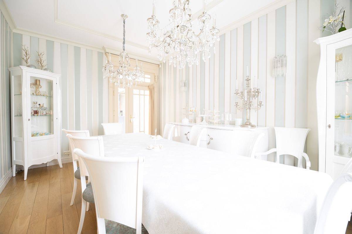 W jadalni duży stół, który pomieści 10 osób, gustowne kredensy na zastawę oraz kryształowe żyrandole nadające wnętrzu luksusowy charakter.