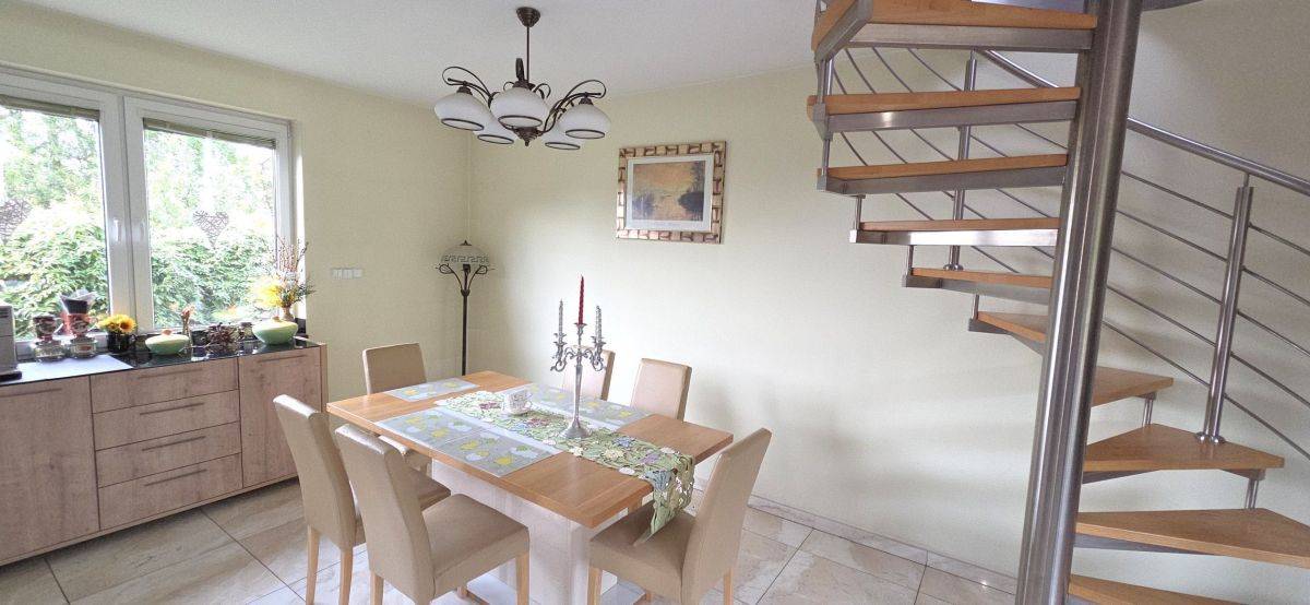Na piętro są dwa niezależne wejścia. Z dwóch pokoi na górze jest wyjście na duży balkon. Dom jest częściowo podpiwniczony, łączna powierzchnia piwnic to ok. 60 m2, podzielone na 3 osobne pomieszczenia w tym m.in kotłownię. Ogrzewanie olejowe. W budynku jest zamontowany gaz więc istnieje możliwość zmiany ogrzewania na gazowe.