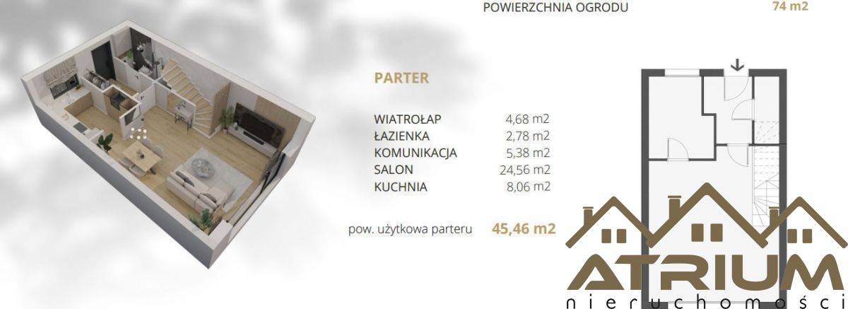 Dom w zabudowie szeregowej przedstawiony w ofercie ma 92,13 m2 + ogród o powierzchni 74 m2 i składa się z :
