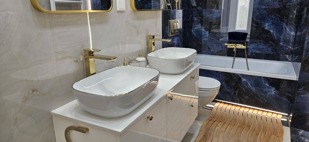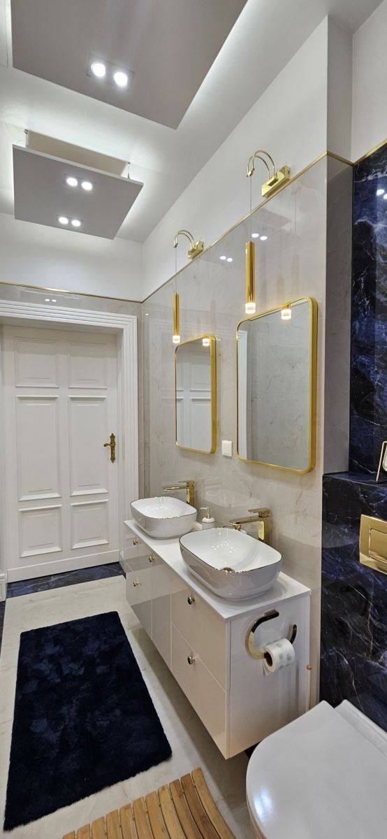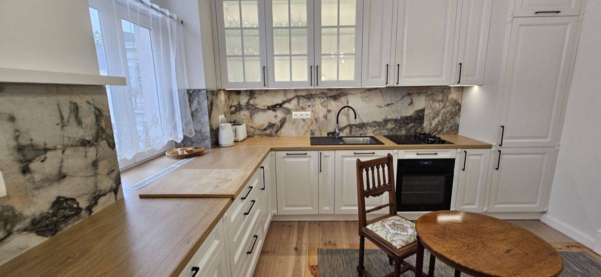 Kuchnię i łazienkę wyposażono w nowe meble, jednak ich styl i detale harmonijnie komponują się z pozostałymi wnętrzami. To doskonały przykład trudnej sztuki łączenia historii i zabytków z nowoczesnością.