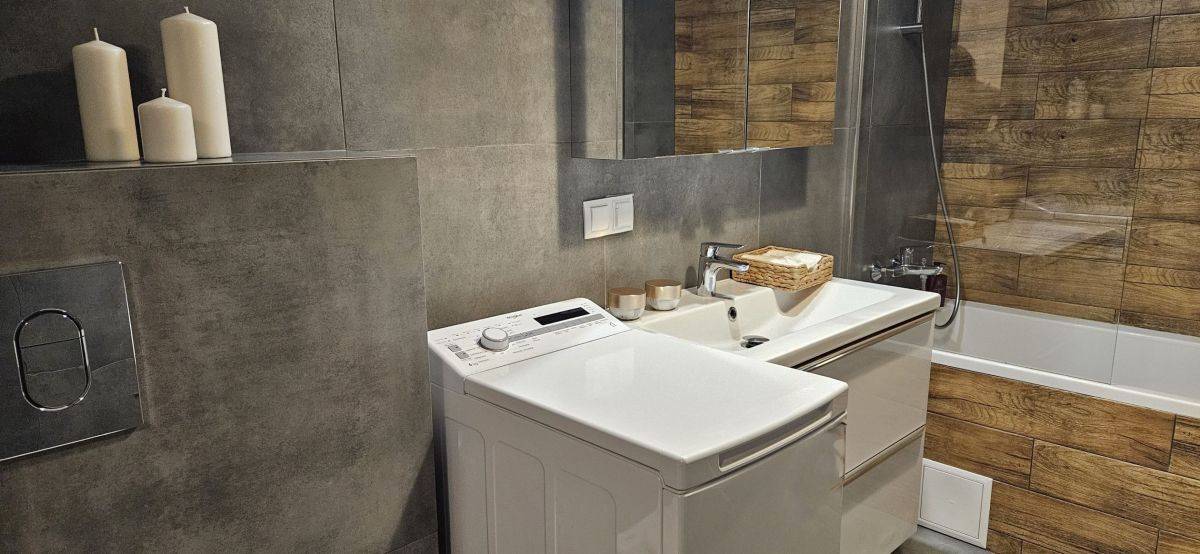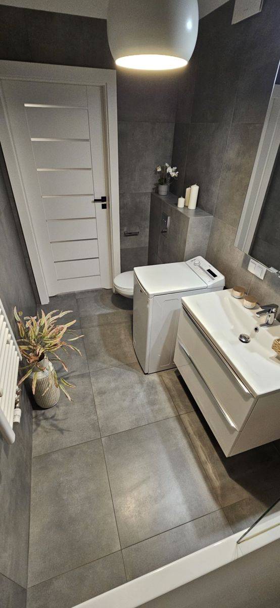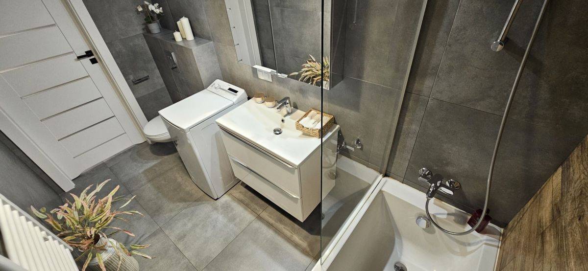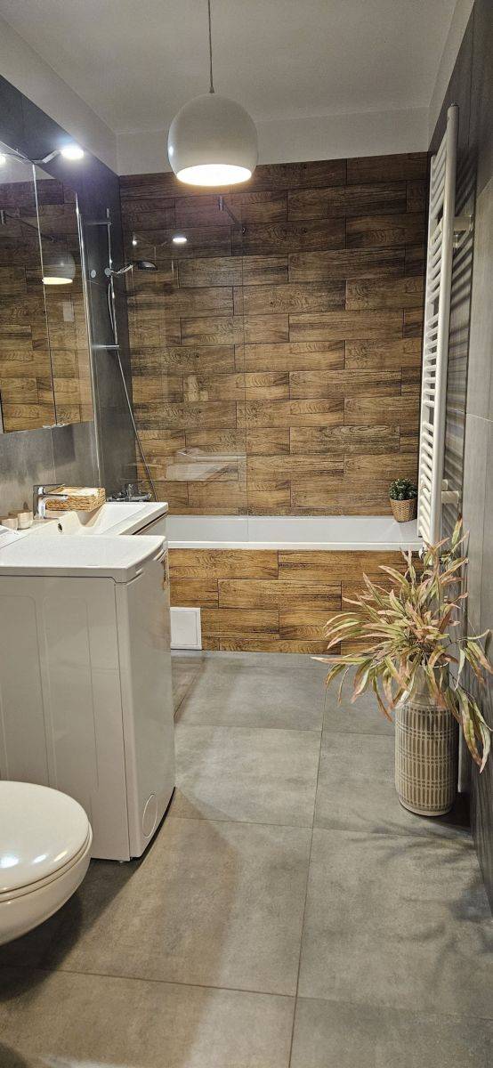 W łazience wanna z parawanem prysznicowym, wc, pralka.