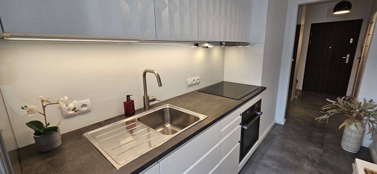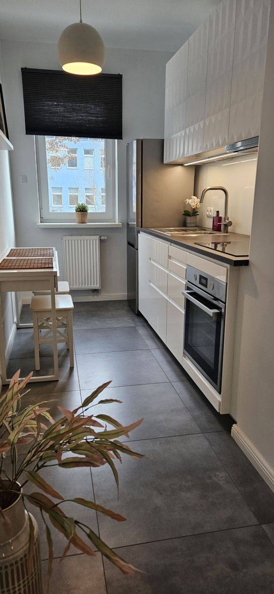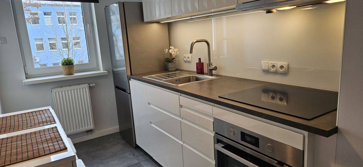 Kuchnia wyposażona w sprzęt AGD - lodówko-zamrażarka, płyta indukcyjna, piekarnik, zmywarka, okap.