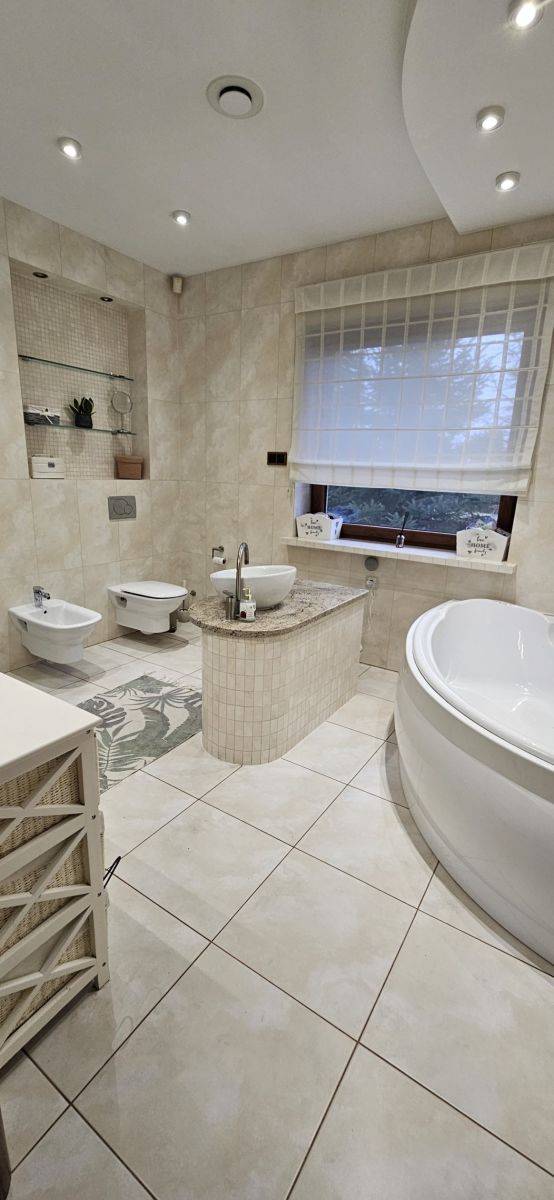 - duża łazienka z wanną, kabiną prysznicową, wolnostojącą wyspą z umywalką, wc i bidetem (12m2)