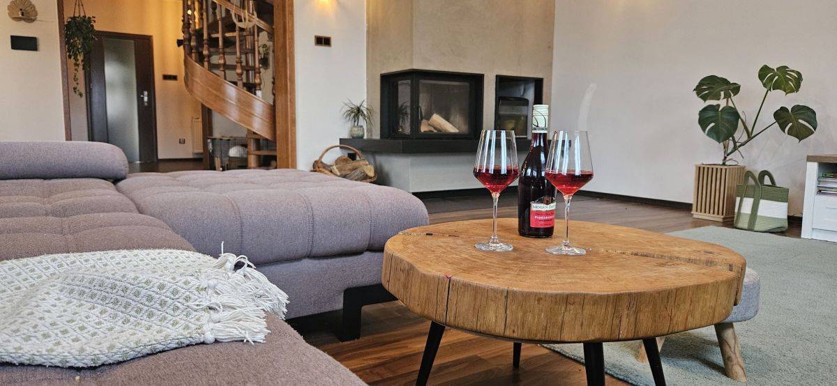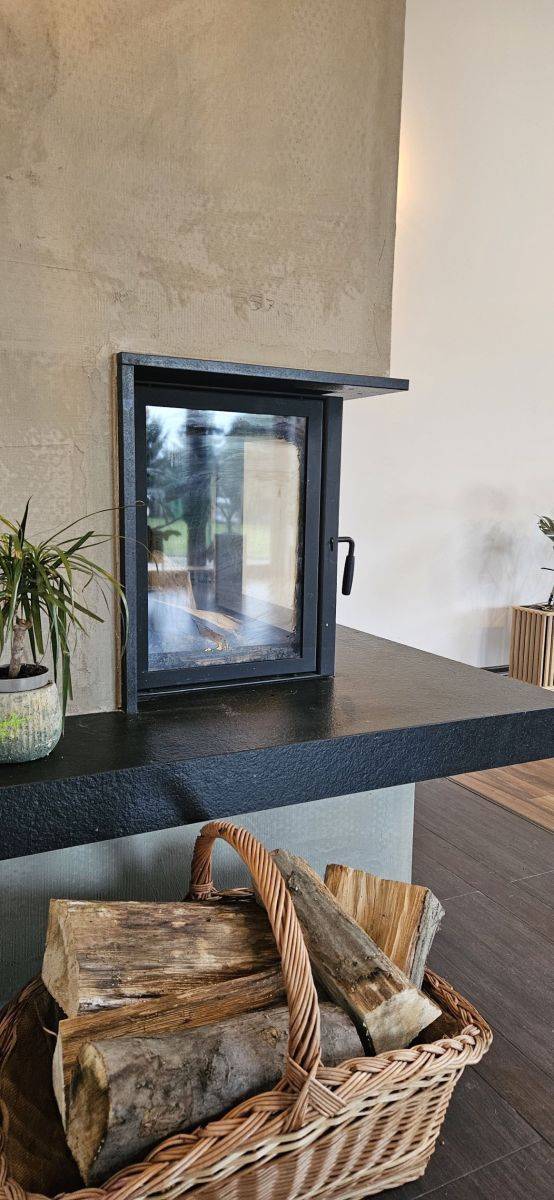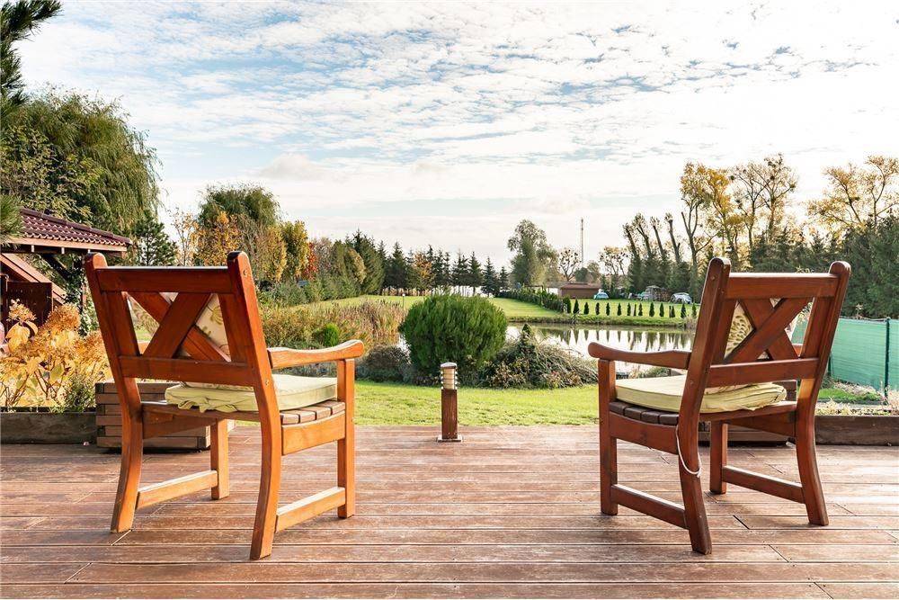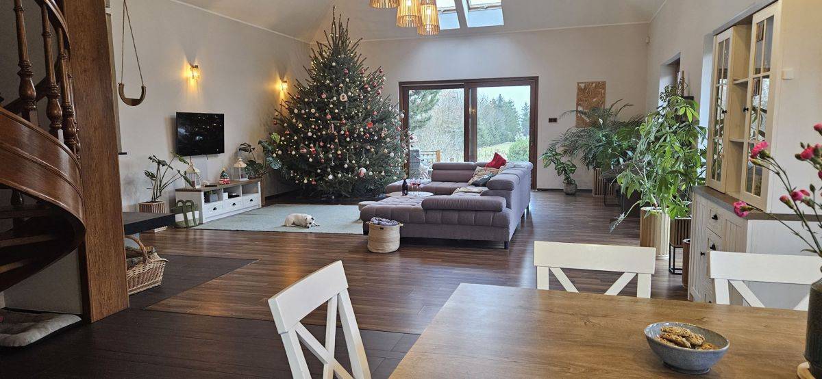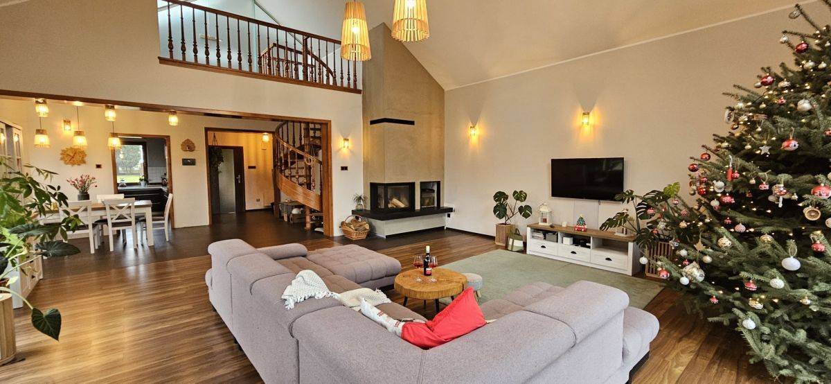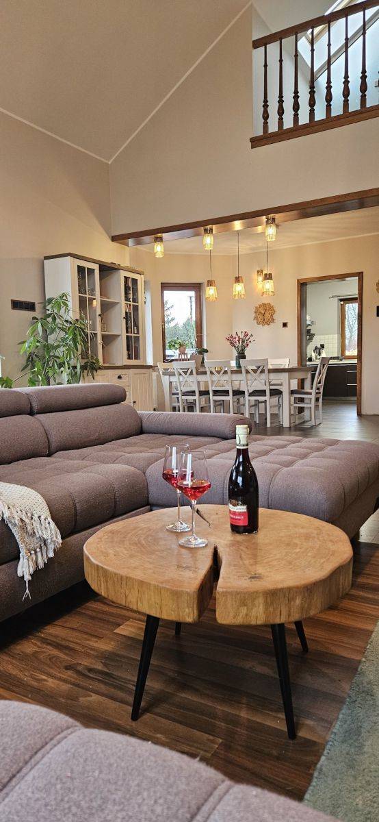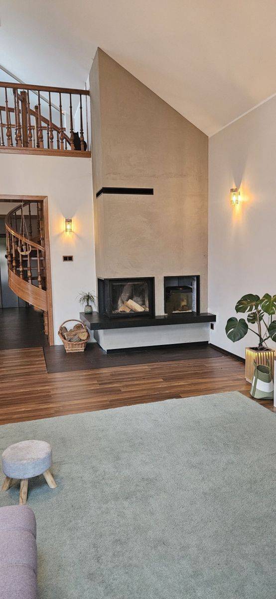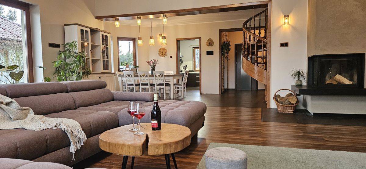 - jadalnia + salon (50m2) z nowym kominkiem DGP (rozprowadzenie gorącego powietrza na pozostałe pomieszczenia). Z salonu wyjście na taras z widokiem na duży ogród i jezioro;