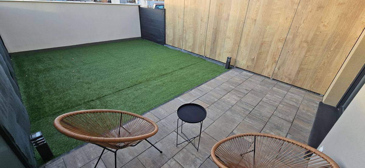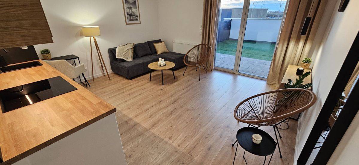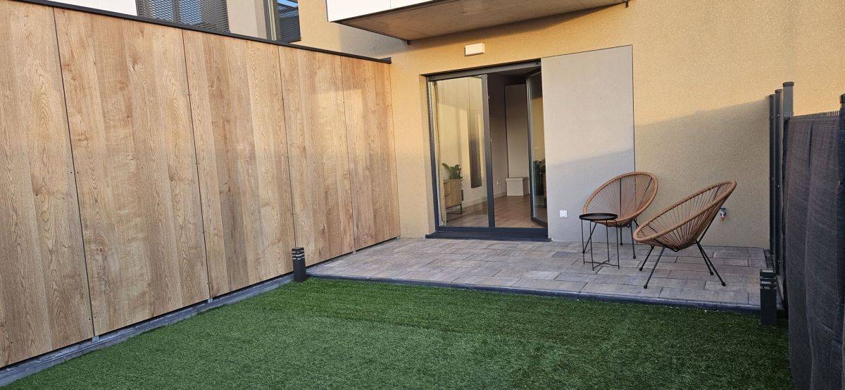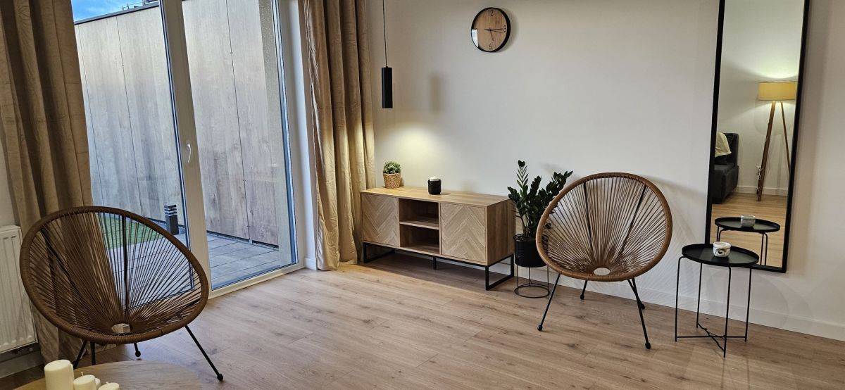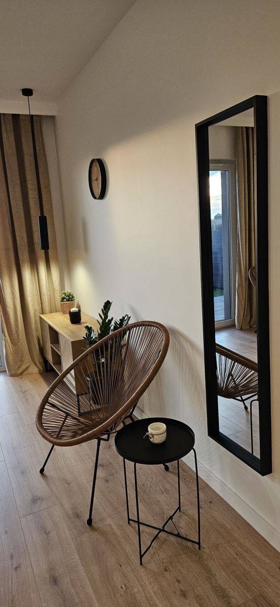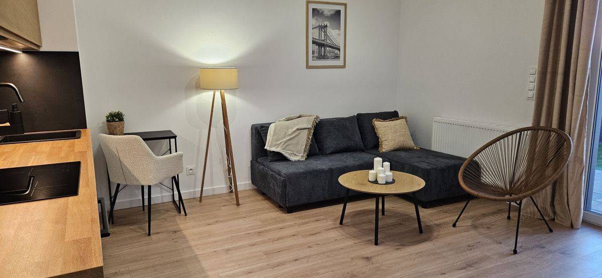 Mieszkanie niewielkie, ale bardzo gustownie i komfortowo urządzone, zaaranżowane przez architekta wnętrz. Składa się z salonu z aneksem kuchennym (stąd wyjście na taras i do ogródka), korytarza oraz łazienki z wc.