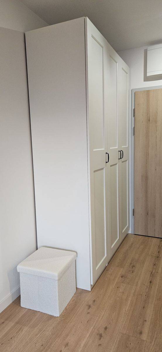 W korytarzu pojemna szafa, szafka na buty, videofon.