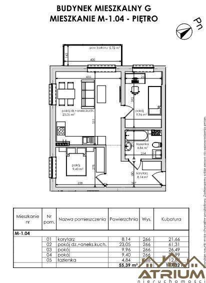 Mieszkanie przedstawione w ofercie 55,39m2 składa się z: