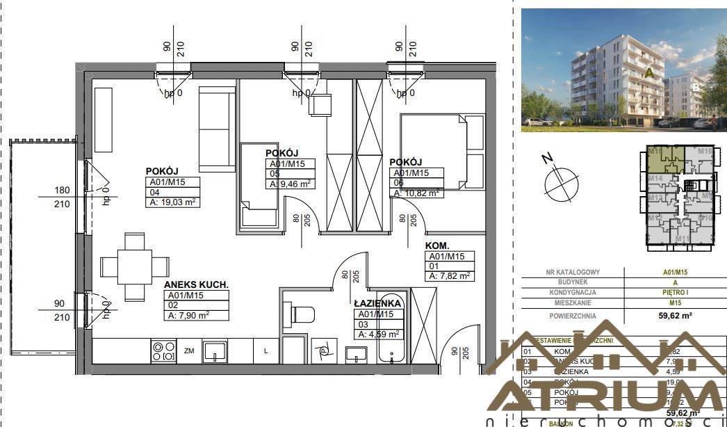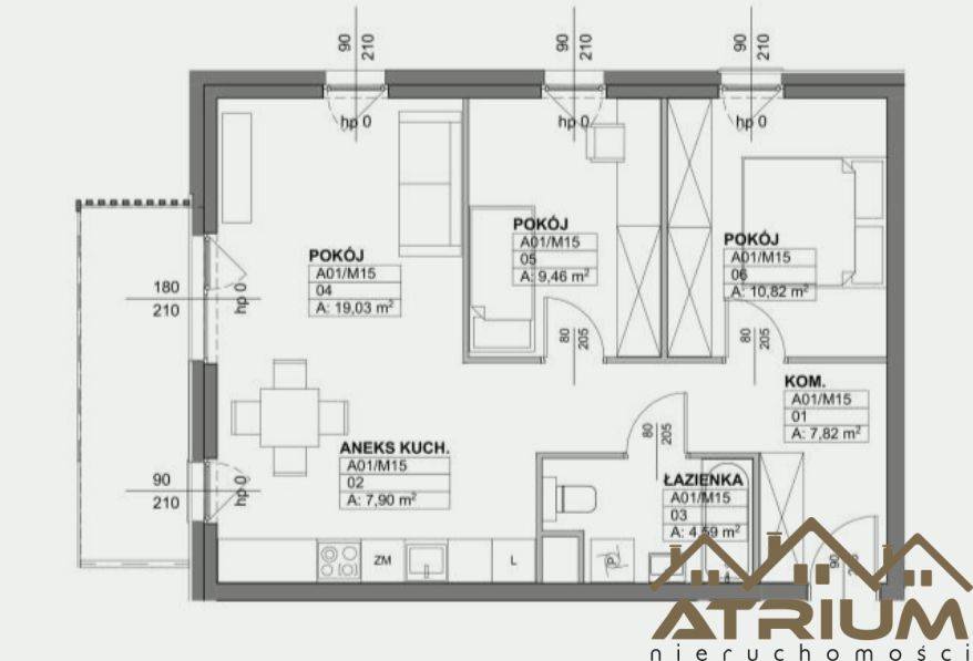 -Pokój 19,03 m2 -Pokój 10,82 m2 -Pokój 9,46m2 -Łazienka 4,59 m2 -Aneks kuchenny 7,9 m2 -Komunikacja 7,82m2