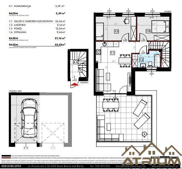 TARAS 32.65 m2 WIATROŁAP 2,39 m2 ŁAZIENKA 5,14 m2 SALON + ANEKS 24.34 m2 POKÓJ 12.04 m2 SYPIALNIA 9.64m2 GARAŻ 16,91m2