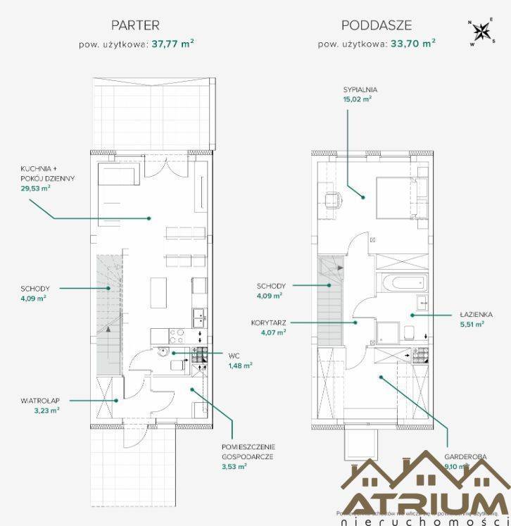 PARTER (37,77 m2) : Kuchnia + pokój dzienny 29,53 m2 WC 1,48 m2 Pomieszczenie gospodarcze 3,53 m2 Wiatrołap 3,23 m2 Schody 4,09 m2