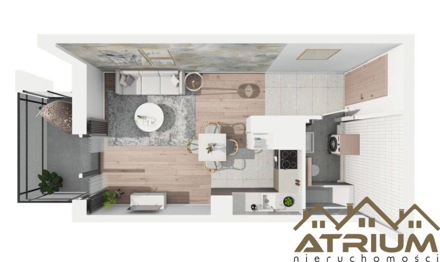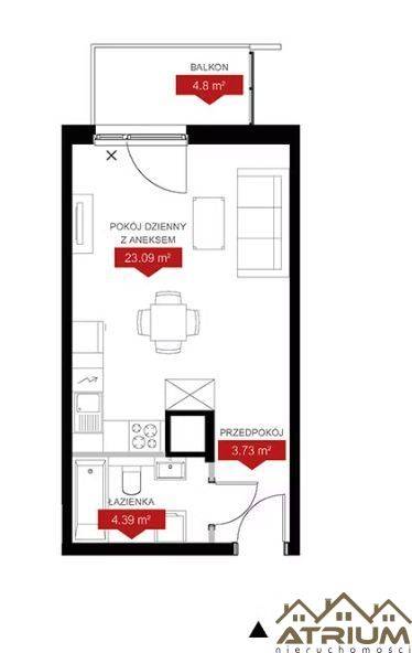 Apartament przestawiony w ofercie ma 31.3 m2 + balkon 4.77m2 i składa się z :