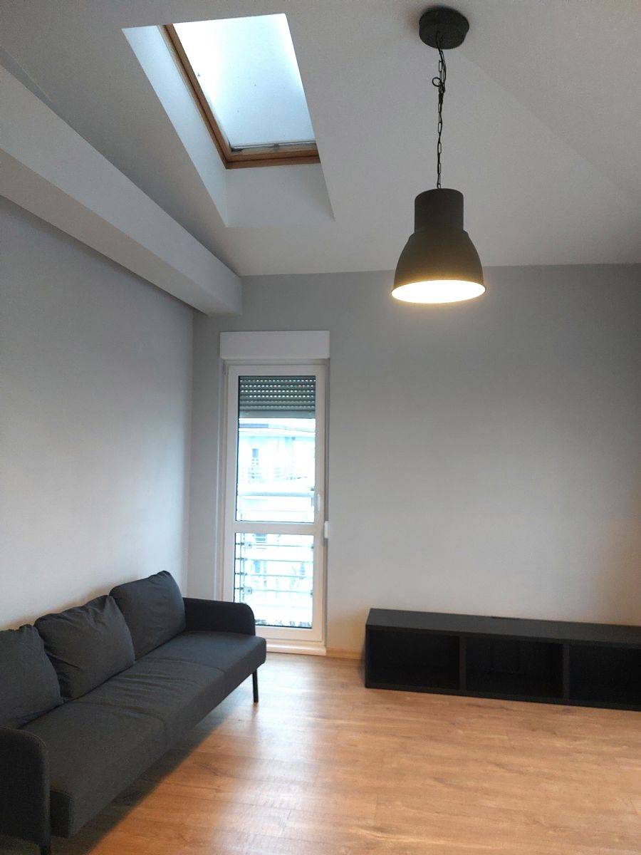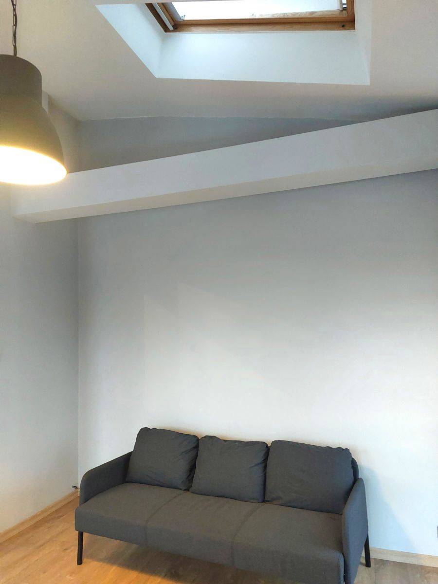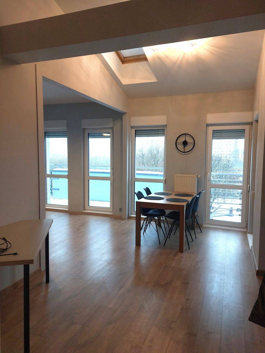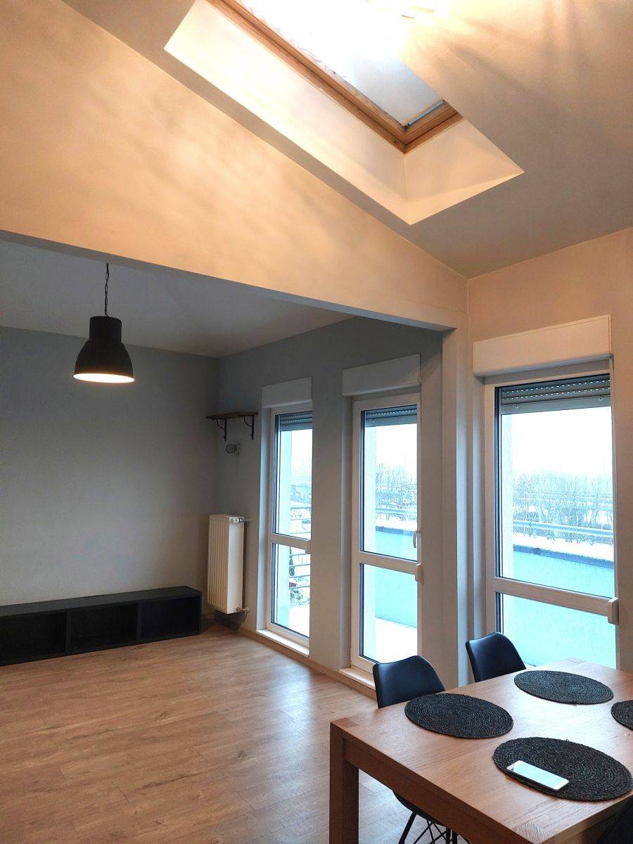 Przestronny salon z kilkoma oknami z każdej strony świata oraz z wyjściami na 2 niezależne balkony a dodatkowo we wszystkich oknach rolety zewnętrzne + dwa świetliki w wysokim suficie