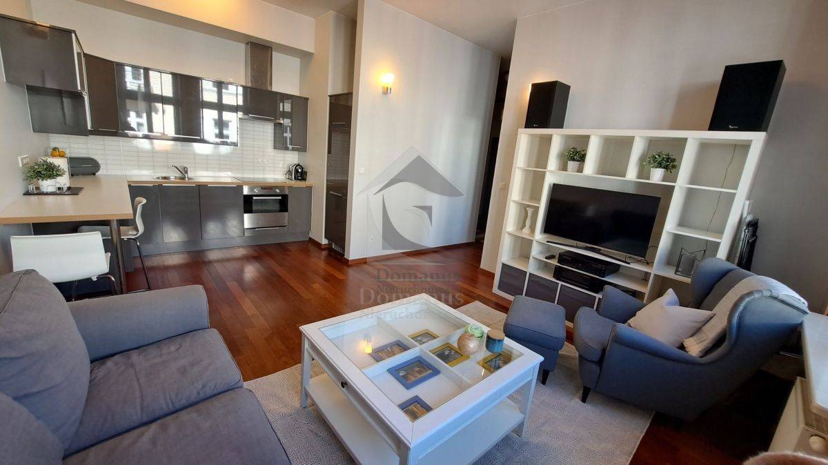 - Umeblowanego salonu połączonego z funkcjonalnym i umeblowanym aneksem kuchennym,