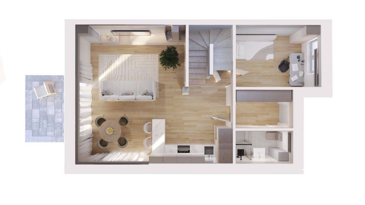 - salon z aneksem kuchennym (35,55 m2) oraz wyjściem na taras,